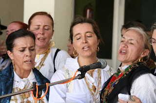 A nossa presença na festa decorreu e tem decorrido de um acto de amor: a Amélia Freitas, depois de enviuvar, refez a sua vida com o Chico Rato, alentejano dos sete costados, homem da restauração  no «Pátio Alentejano» em Évora, membro dirigente da Associação Cultural de Barrada, cantador, animador. A festa da padroeira, Nossa Senhora da Conceição, acontece naquela capelinha do lugar e consta de missa, procissão e outras actividades festivas, desde a véspera. Nós temos ido para cantar a missa, fazer a procissão e mostar os nossos bailes. É uma jornada de viagem demorada, sete horas para lá, seis para cá, conforme as paragens de conveniência. O senhor padre Manuel lidera as cerimónias e valoriza muito bem a dimensão popular que a tradição cunhou nos festejos: a procissão corre as ruas de Barrada, com instrumental da banda dos bombeiros de Alvito, com reza dos mistérios do terço e cantos processionais da nossa parte. O povo segue em filas com as velas acesas. Há uma ou outra porta entreaberta, mas a aldeia está sempre mergulhada no maior sossego, com tantos pormenores de habitabilidade como de isolamento. Ficam as ruas abençoadas, os caminhos, as casas e os campos. Costuma estar mais frio que calor quando a cerimónia recolhe à capelinha, por isso este ano os bailes foram no salão da sede cultural, ali ao lado, onde se almoça e se janta, onde está o bar e todos os serviços associativos. As pessoas estimam-nos e a relação criada passa já por apertos de coração: existe uma empatia de saudação, mas também de conversa, de conhecimento progressivo, Já nos vemos envelhecer juntos e fazemos sempre votos para mais um ano: «chorai olhos, chorai olhos / que o chorar não é desprezo / também Maria chorou / quando viu seu filho preso» - foi assim a moda alentejana entoada pelo ponto e erguida pelo alto. (Escrito por JM, em 13/12/2011)